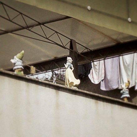 Una strana immagine, quella che ha accompagnato questa edizione del Premio Scenario infanzia. Il parapetto di un balcone, forse stratificato nell’edilizia di un palazzone di provincia, ospita le statuine di Biancaneve e i sette nani. Se ne stanno lì come in equilibrio, dando le spalle agli sguardi che si alzassero dalla strada per osservarli. Ma pare che nessuno li abbia mai notati, prima che fossero fotografati. Loro si rivolgono all’interno, agli abitanti del balcone, contribuendo a una scenografia di panni e salumi appesi ai fili.