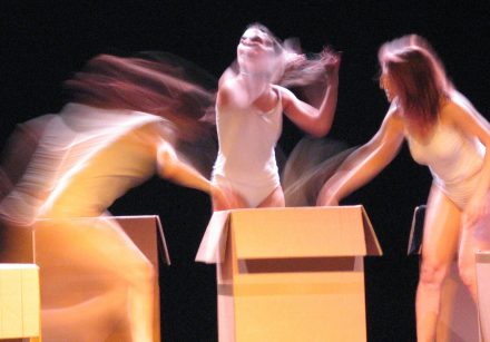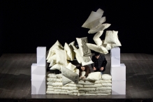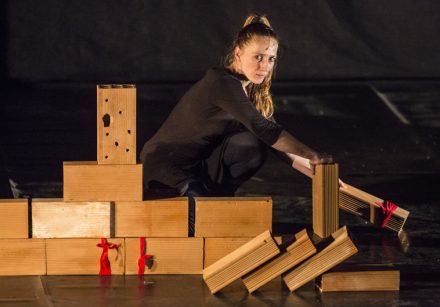 “In un luogo popolato di scatole di cartone, palazzi, rifugi, loculi, buchi neri che risucchiano e generano corpi, sentimenti, situazioni in continuo annullamento, rinascita, trasformazione, si racconta per bagliori di danza e beckettiane implosioni un’attesa, un disastro, varie lotte, la speranza di una partenza.