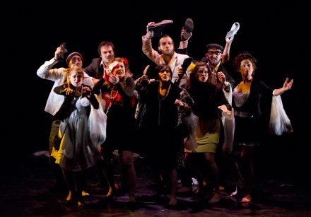 La genuina capacità di prendere posizione e parola si realizza attraverso un linguaggio teatrale multiforme, che sovrappone e monta stili diversi, generi e ambienti abitati da tipi nazionali di immediata riconoscibilità.