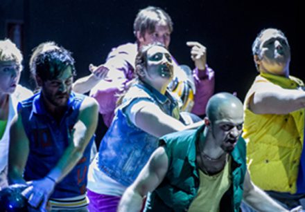 Fermo a Katzelmacher, in un sud che è magma di province e dialetti, c’è un treno che non parte, metafora di un’attesa consumata fra indolenza, sogni a buon mercato, kitsch di canzoni neomelodiche, vitalità bloccata in un eterno ralenti. La compagnia nO (Dance first. Think later) sceglie la sfida di un lavoro collettivo per portare in scena una pluralità disordinata di voci, attitudini, fisicità eccessive e debordanti che sono specchio di spaccati sociali osservati con attenzione. Una tensione sempre pronta ad esplodere si catalizza nell’arrivo dello straniero e si blocca su un motorino che non parte, prima di ogni corsa possibile.