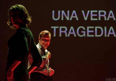 Una Vera Tragedia è un’originale sperimentazione del dispositivo drammaturgico in cui il testo incombe sulla scena in forma di proiezione e procede con sorprendente autonomia scardinando il rapporto fra testo e azione drammatica. L’identità biografica e psicologica dei personaggi è continuamente resettata e messa in crisi in un interno borghese che richiama l’immaginario lynchiano e le atmosfere sospese e inquietanti dei dipinti di Hopper. In un momento in cui cinema e serie televisive propongono modalità narrative sempre più efficaci, Una Vera Tragedia è un thriller torbido e feroce che apre un discorso critico sulla prosa teatrale, ne scardina con radicalità i meccanismi rilanciando il teatro oltre i suoi codici.