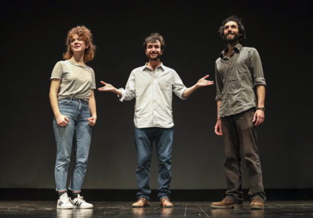 Una scena spoglia, presidiata da due attori e un’attrice che interrogano la contemporaneità in un dialogo frontale con il pubblico, simulando situazioni tipo della normale disumanizzazione e monetizzazione dei rapporti sociali.
