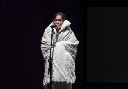 Il video, nel suo sapiente utilizzo, insieme alla presenza della performer e del suo “aiuto” tecnico, divengono unico corpo scenico, in un’invasione di campo che tutti ci sovrasta e che tutti irrimediabilmente ci coinvolge.