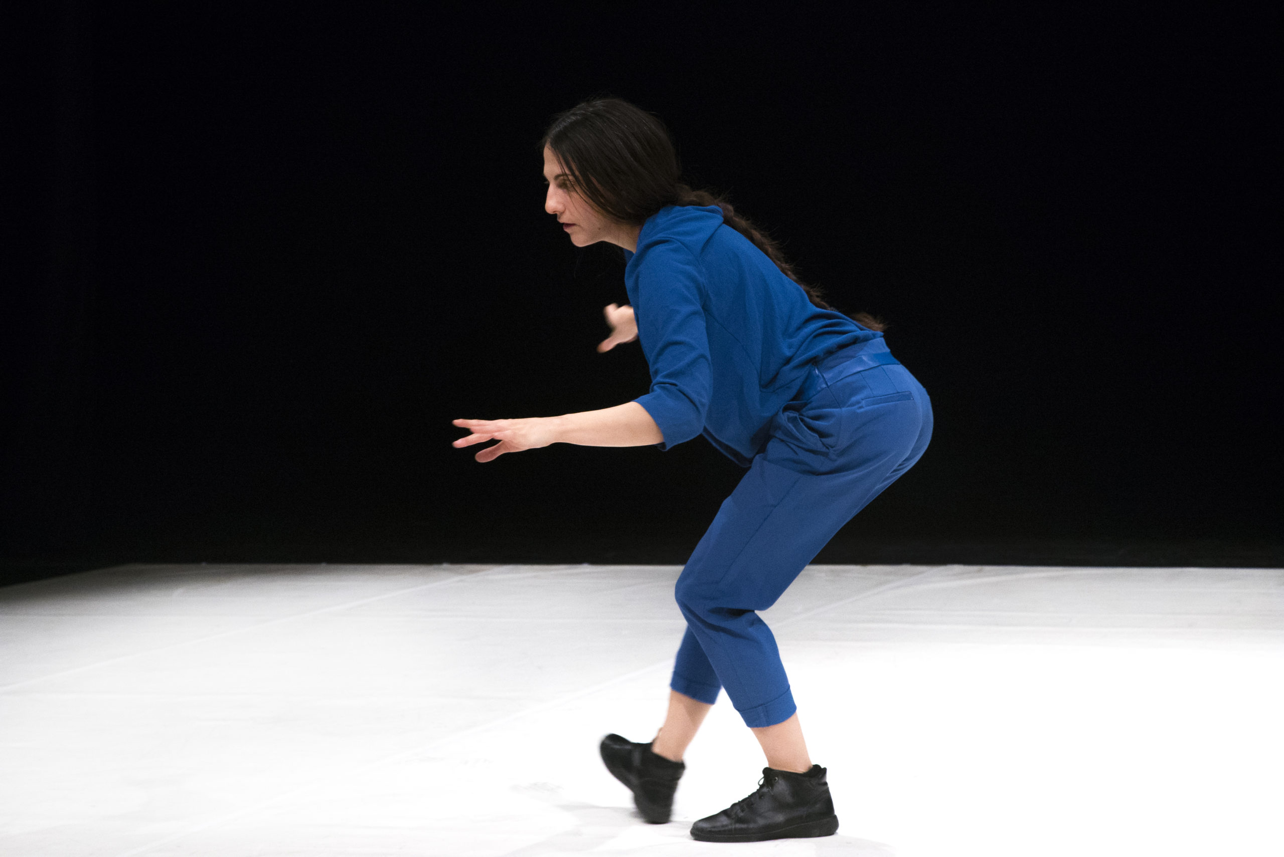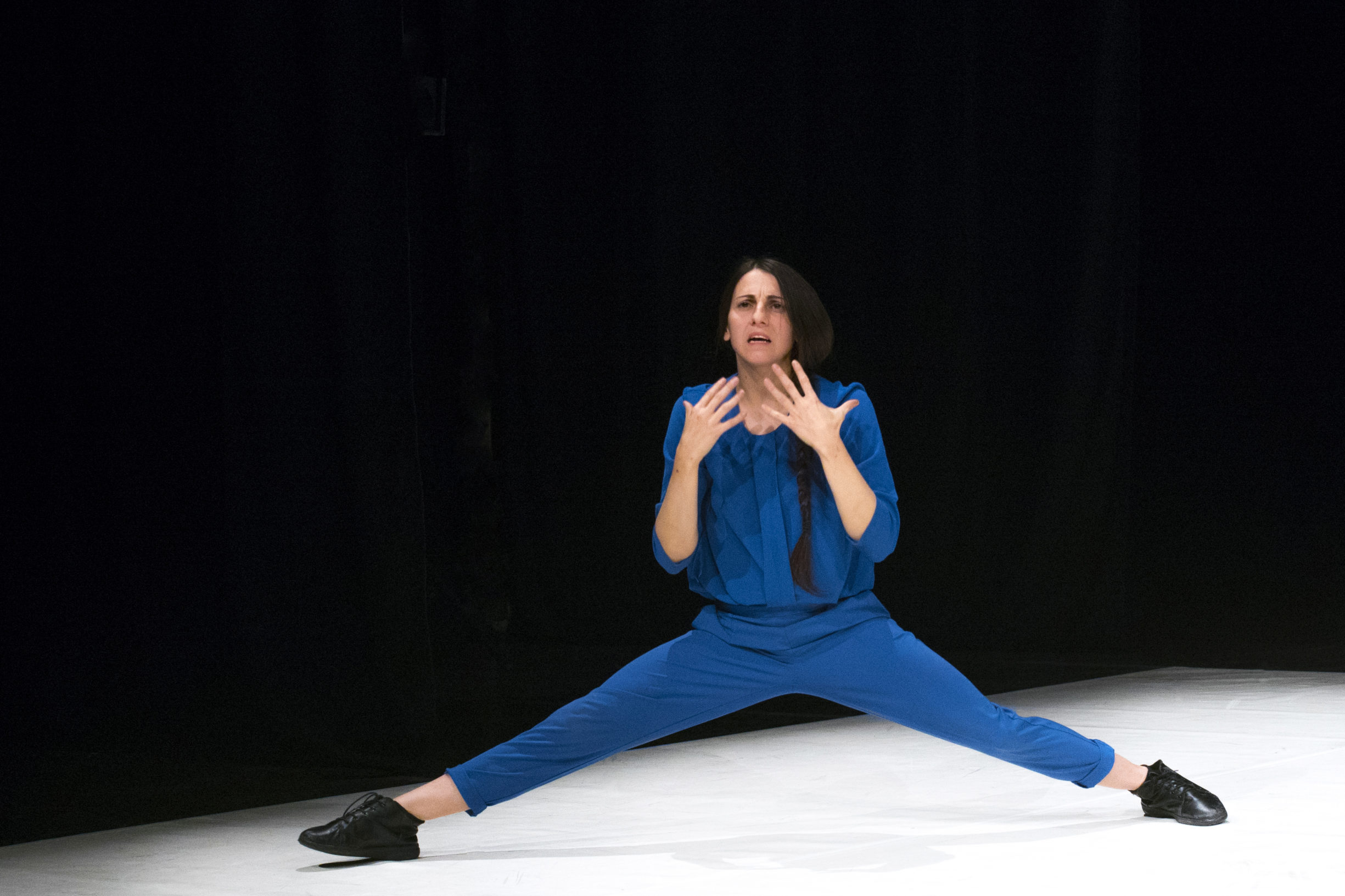 Il processo creativo si basa sullo sviluppo di pratiche che tendono a espandere la “Coscienza del corpo” e la “Coscienza della mente”, muovendosi dal rituale al performativo. Tali pratiche: “Meditazione del pensare”, “Meditazione del corpo”, “Meditazione della voce” generano specifici stati che creano una presenza performativa e uno specifico linguaggio coreografico. Contemporaneamente il processo si alimenta delle connessioni con alcune teorie sui processi mentali e fisici trattati in bioenergetica (Lowen). Tale creazione prende forma, si alimenta e modifica nell’incontro con il pubblico. Gli elementi parola, voce, corpo e luci creano una coreografia tra il visibile e l’invisibile, il materiale e l’immateriale.