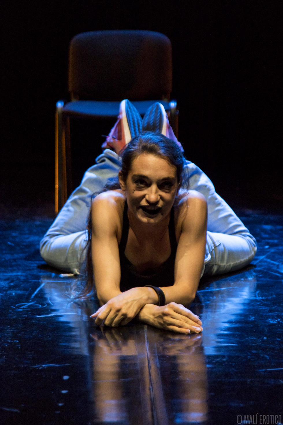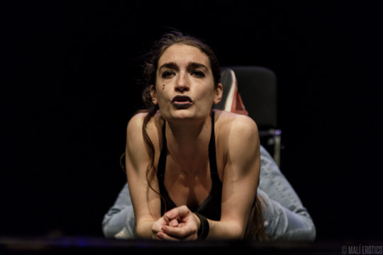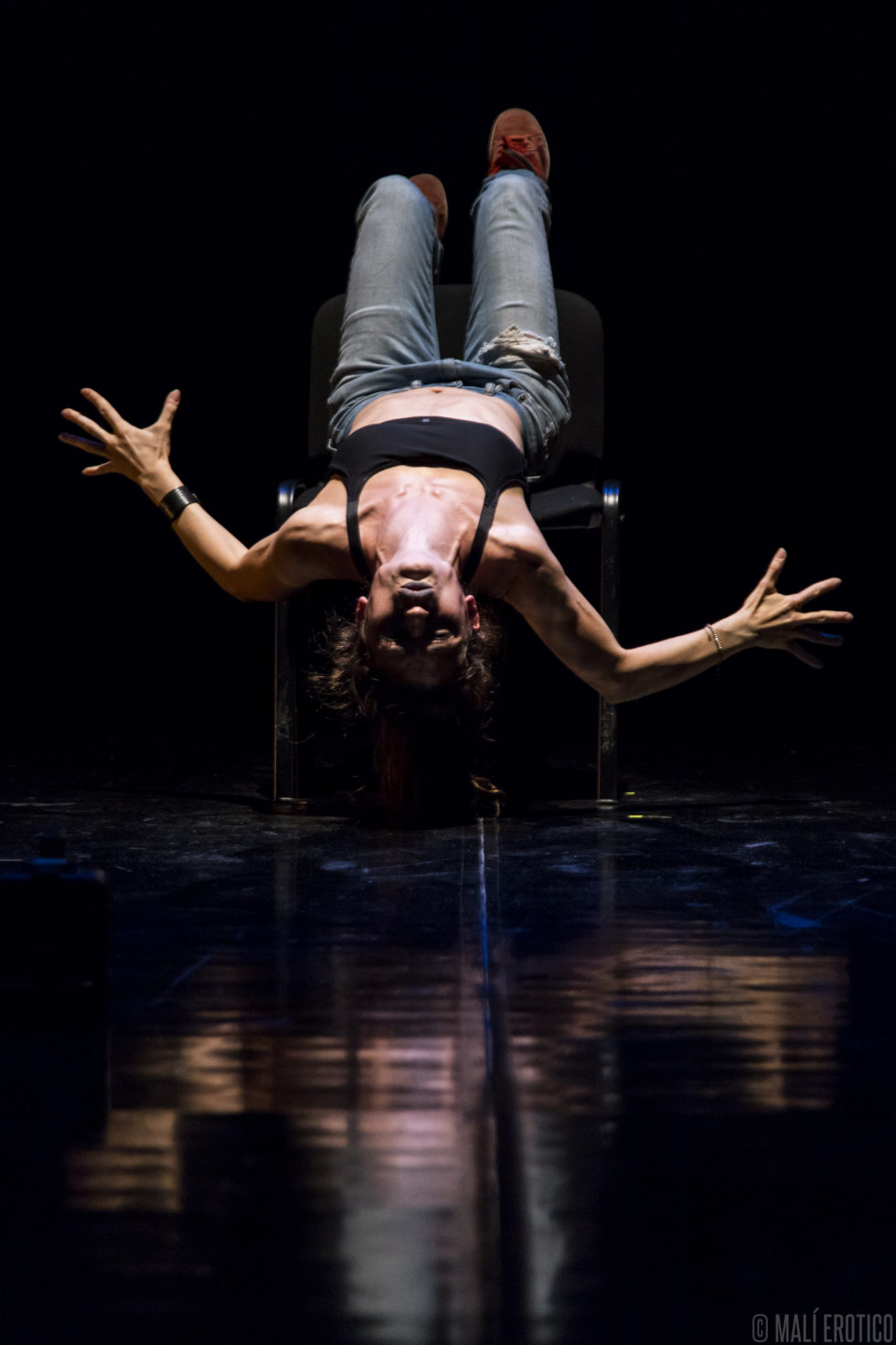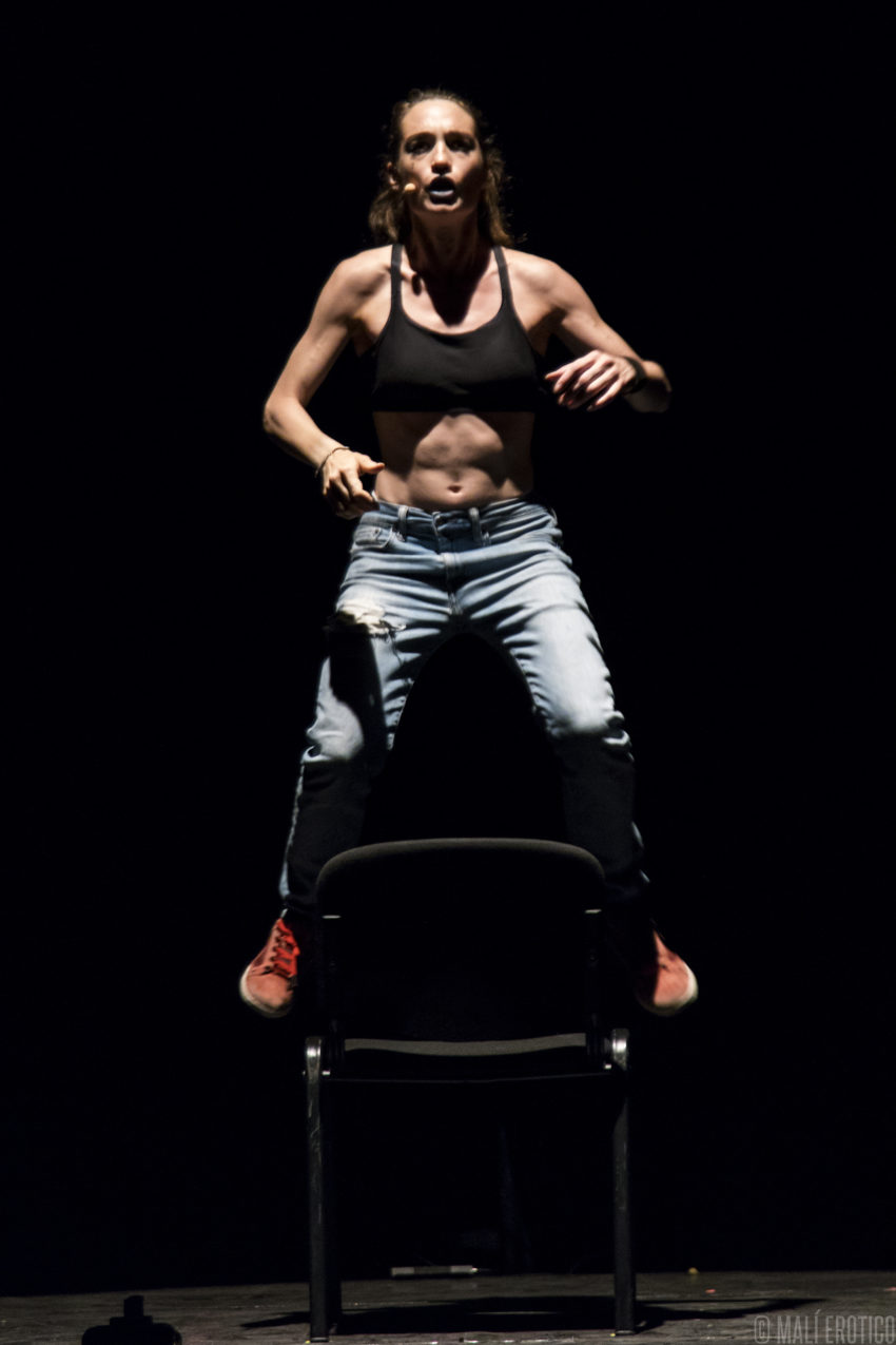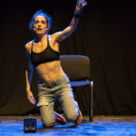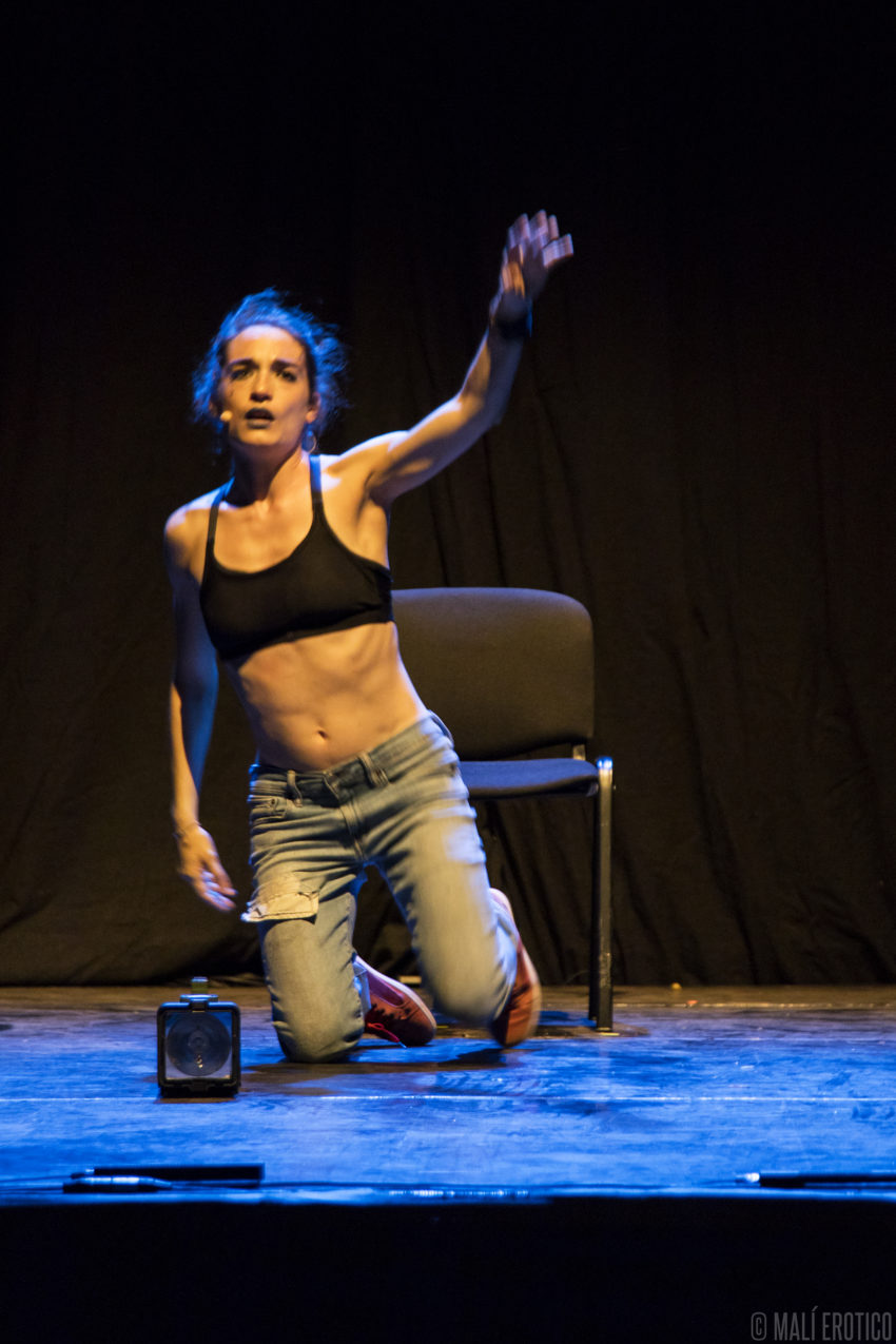 In scena c’è una sedia cui ruota intorno, sopra e sotto, la performance di un’attrice. Le luci e il suono si fondono alla performance, ne diventano i compagni di viaggio.