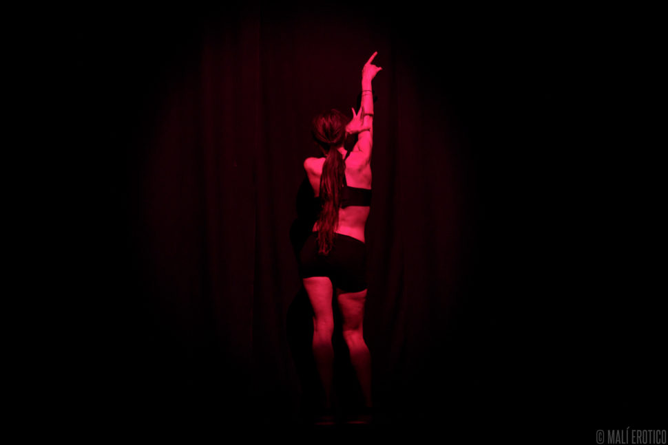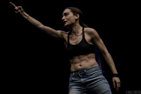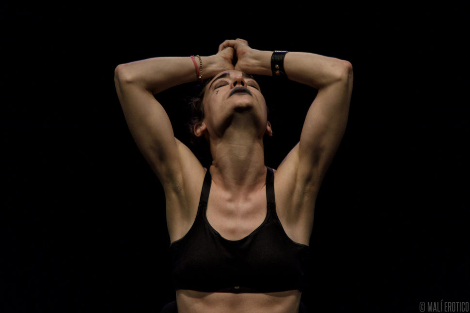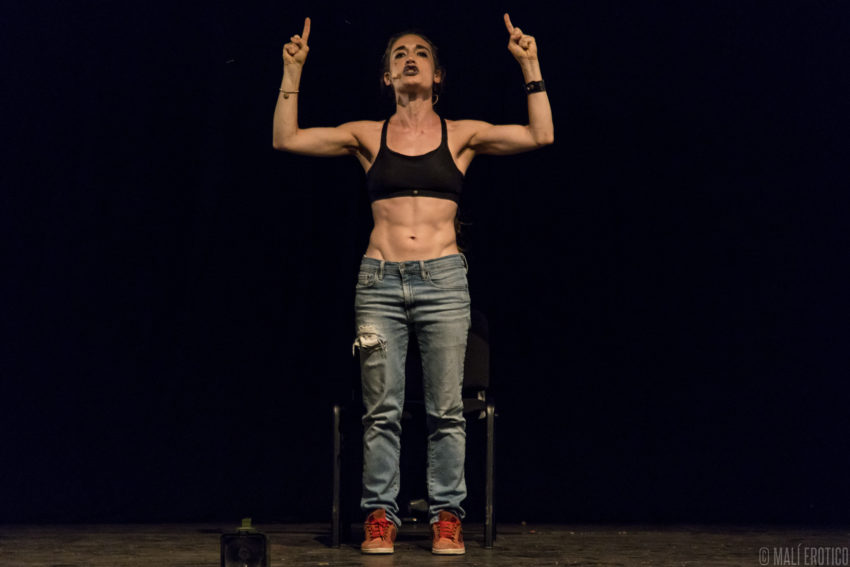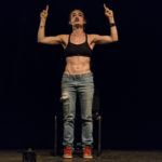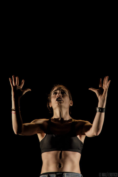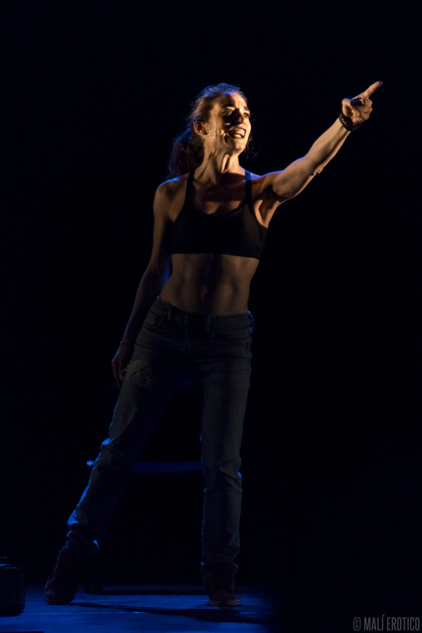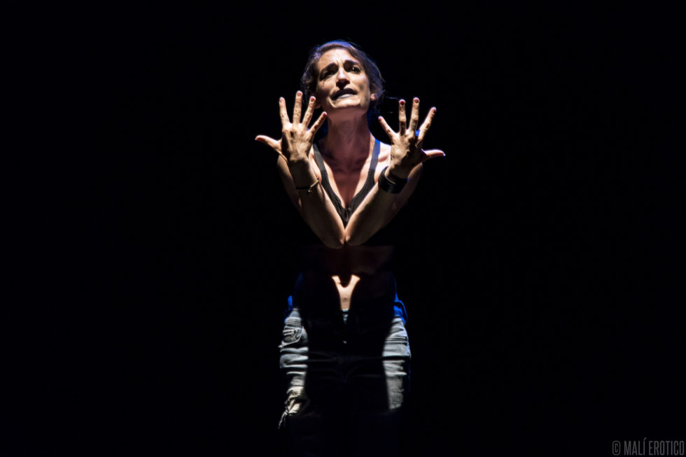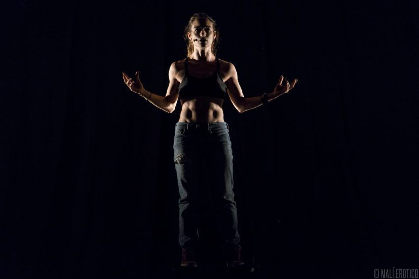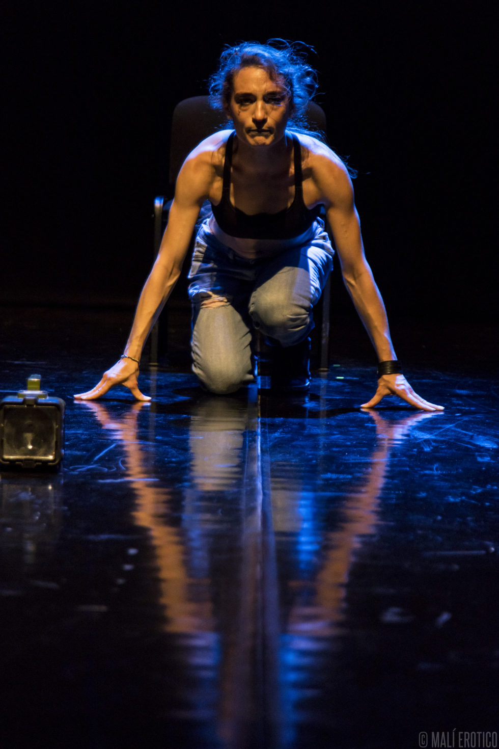 In scena c’è una sedia cui ruota intorno, sopra e sotto, la performance di un’attrice. Le luci e il suono si fondono alla performance, ne diventano i compagni di viaggio.